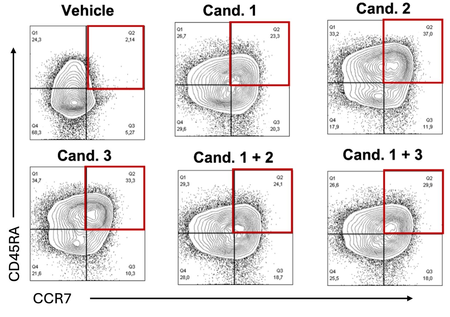 Optimized combinations to fine tune simultaneous targets. Human T cells were activated and expanded. The presence of candidates 1, 2, and 3, along with their combinations, supported a less-differentiated (“younger”) phenotype of T cells during expansion (indicated in the red quadrant) compared to the vehicle control.